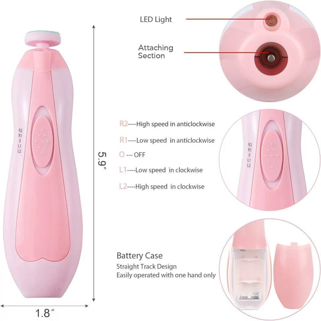 (Despachos a nivel Nacional. Envío Gratis Bogotá y Alrededores) Nuestro cortaúñas eléctrico para bebés es súper fácil de usar con solo 1 botón para controlar la velocidad y la rotación (sentido horario/antihorario). Puede elegir la velocidad y la dirección de giro al cortar las uñas de las diferentes manos. El exquisito recorte y pulido completo hace que las uñas de los pies y las uñas de su hijo sean más suaves y tersas. Se alimenta con 2 pilas AA (no incluidas). A diferencia de otras herramientas tradicionales para cortar uñas, nuestra lima de uñas para bebés más segura es muy suave con las uñas de su bebé y funciona de forma eléctrica. No dañará las cutículas de su niño pequeño ni las uñas blandas. Corta y pule de forma segura y rápida las uñas de los pies y de las manos. Nuestra lima de uñas eléctrica para bebés viene con 5 cabezales de pulido, lijas acolchadas de alta calidad diseñadas para las diferentes etapas del crecimiento de su bebé y sus diversas necesidades.